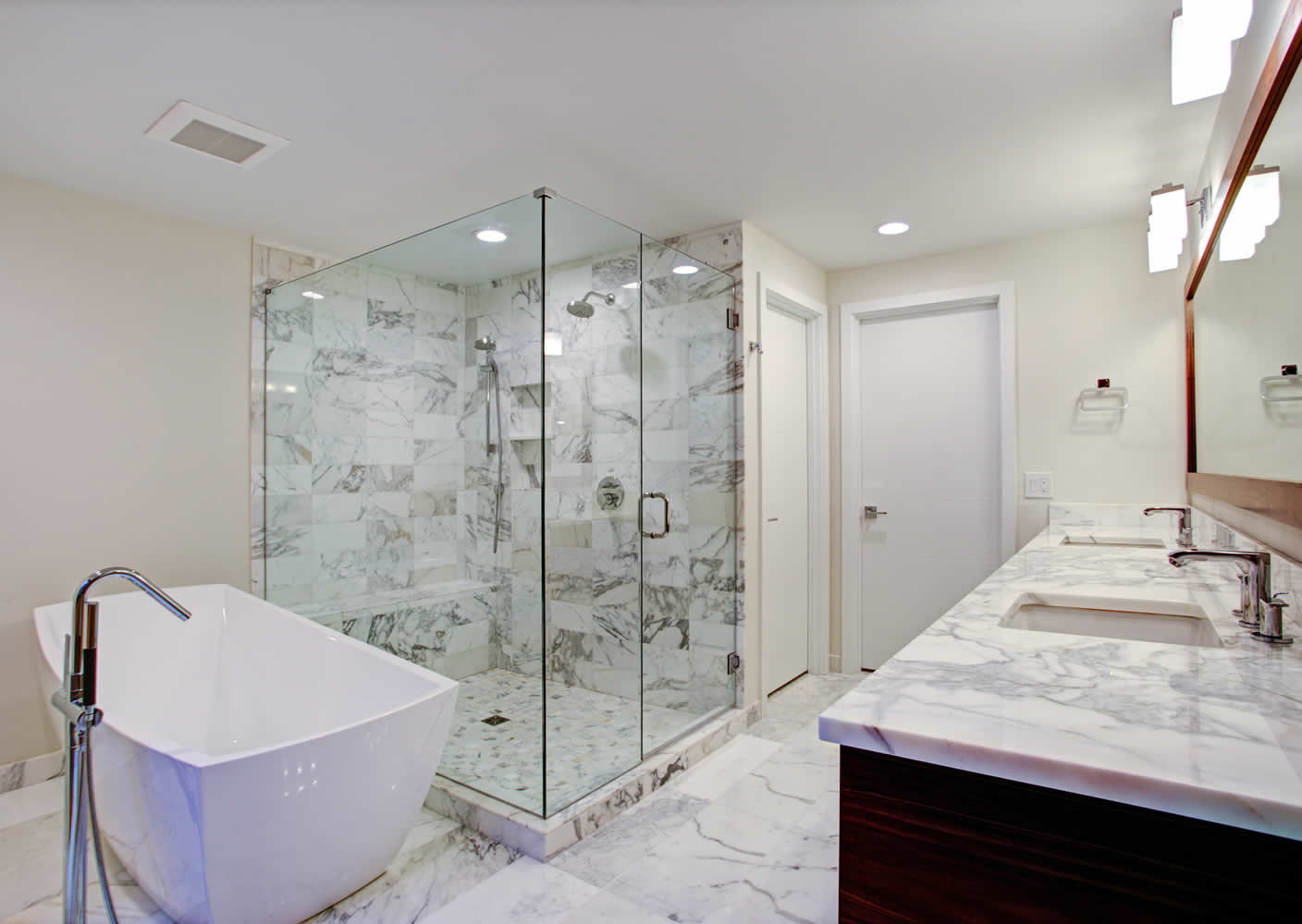 Custom glass shower doors & enclosures, glass panels and splash walls.